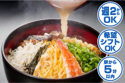 | 時間 | (A)8:00〜15:30 休憩1時間 実働6.5時間 (B)14:30〜22:00 休憩1時間 実働6.5時間 ※早番と遅番を合わせたシフト制 学生 17:00〜22:00 実働5時間 |