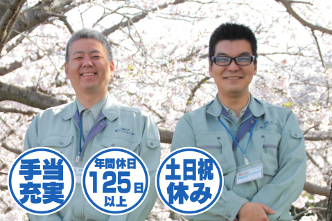 | 時間 | 変形労働時間制(1ヶ月単位) 【例】 8:00〜17:00 ※休憩90分 12時〜13時の60分、10時〜と15時〜それぞれ15分 休憩時間は作業の状況により異なる 残業月平均25時間程度あり |